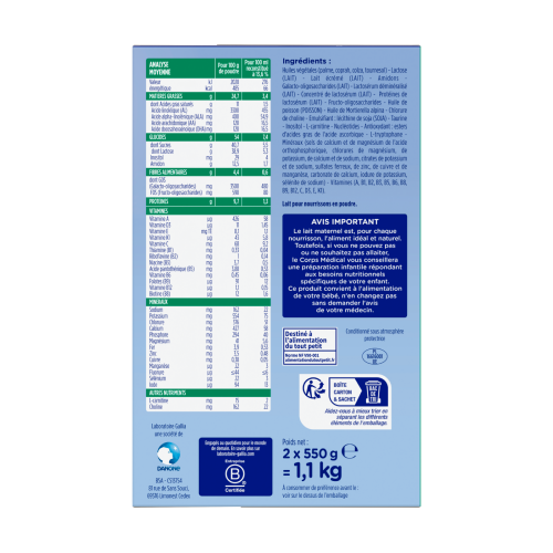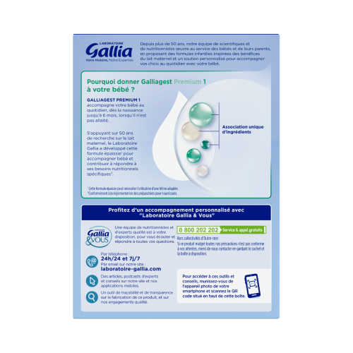 Laboratoire Gallia encourage l'allaitement maternel au moins jusqu'aux 6 mois de l'enfant en accord avec les recommandations de l'OMS. En effet le lait maternel est l'aliment le mieux adapté aux besoins spécifiques des bébés. Par ailleurs, la réglementation interdit aux industriels de l'alimentation infantile de communiquer sur leurs laits pour nourrissons (0-6 mois). Consultez votre médecin.