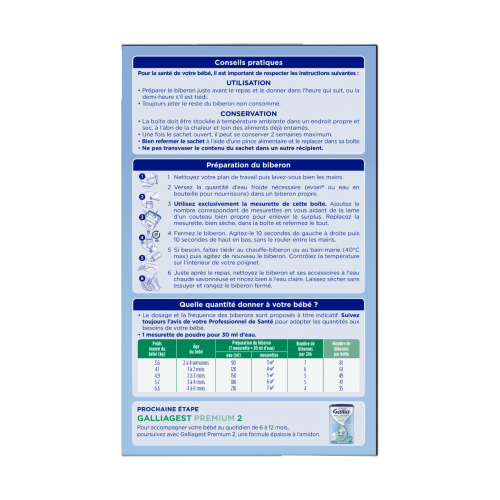 Découvrez le lait en poudre Galliagest Premium 1er âge, une formule épaissie (pouvant nécessiter l’usage d’une tétine adaptée) qui répond aux besoins nutritionnels de bébé de 0 à 6 mois.