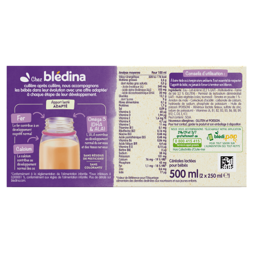 *Un apport lacté adapté qui participe à la couverture des besoins de bébé en calcium, fer et omega 3 (DHA & Acide alpha-linolénique)