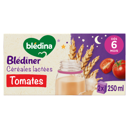 Nouvelle recette : Blédîner Céréales lactées Tomate, c'est un savoureux repas complet pour bébé avec un apport lacté adapté*, des céréales et des légumes au goût tout doux ! Et le tout dans un format pratique & prêt à l'usage !