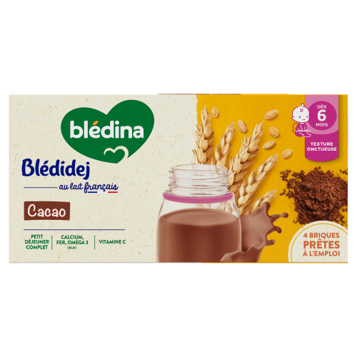 Blédidej, ce sont de délicieuses céréales lactées au goût tout doux et à la texture onctueuse pour bien commencer la journée ! Découvrez Blédidej Cacao pour un petit-déjeuner complet et équilibré à la saveur gourmande du cacao dès 6 mois.